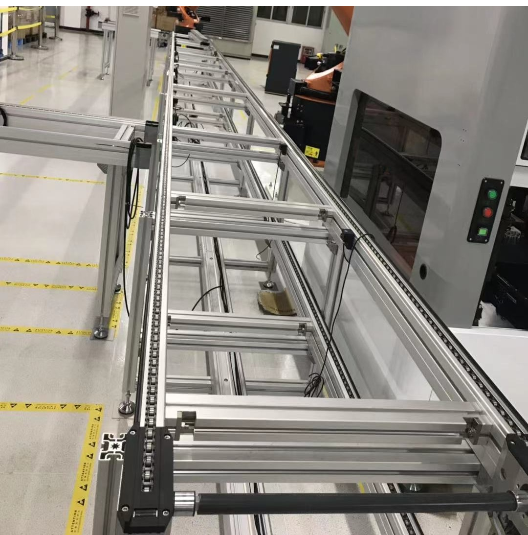 单个托盘能承重250公斤,整条线段的总负载能达到2.2吨。结构非常紧凑,运行非常平稳顺滑,不会出现传统3倍速或者2.5倍速链条常见的窜动问题。在整个运行过程中,没有出现集中的磨损问题,测试下来效果非常好。相比市面上的普通倍速链,它更耐用、更稳定,特别适合需要长时间连续输送的生产场景。可以应用在汽车零部件装配、电机生产线和制鞋加工线上。