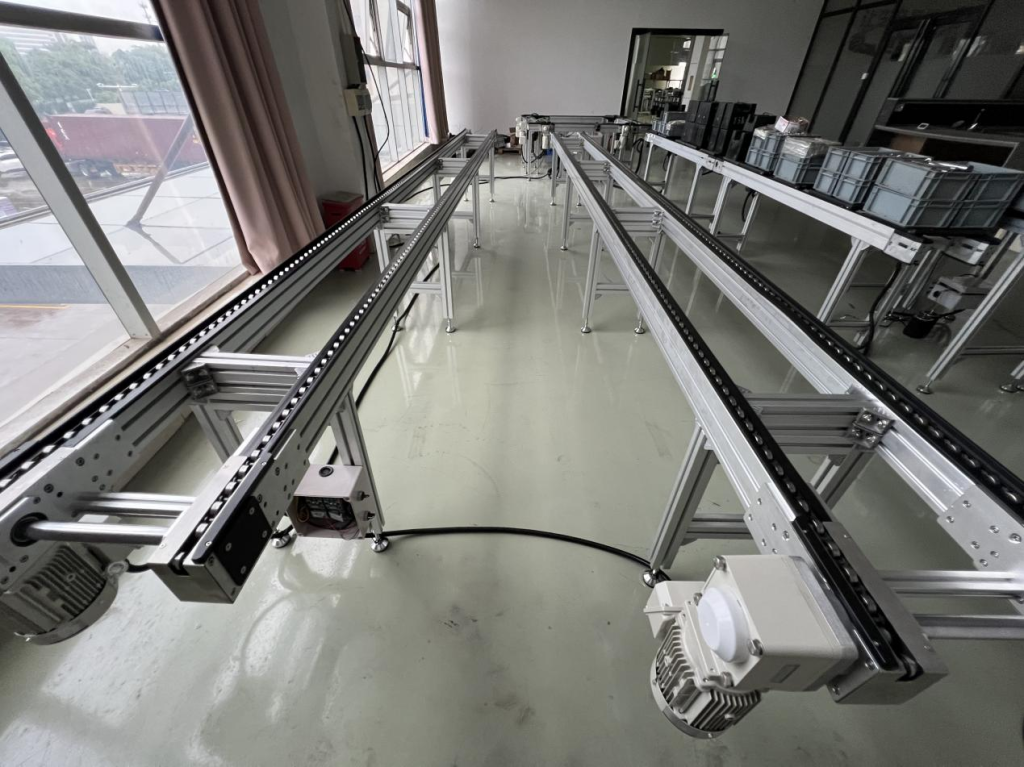 片基带式系统也叫平皮带输送线,同样能满足电子行业的基础输送需求,但片基带的结构设计,让它在扛重和跑远路上更有底气。它的皮带由双面纤维织物和中心强力片基层组成:双面纤维织物自带永久性抗静电属性,耐磨性还极强,能应对高频次的托盘摩擦;中心片基层柔韧性十足,就算是高速运转(最大速度18m/min),也能保持皮带平稳,不会让托盘跑偏。