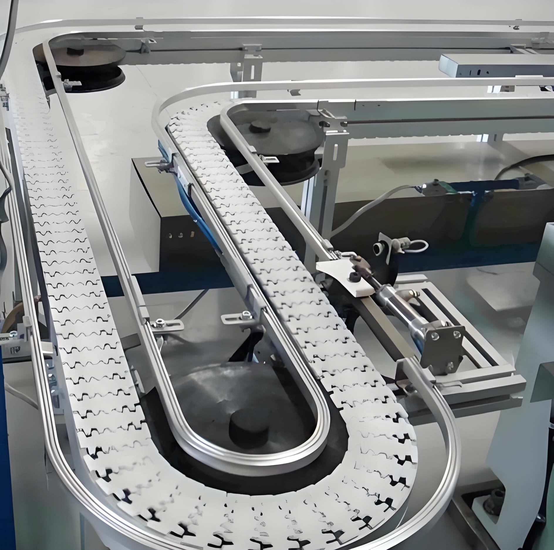 - 输送链用的是高强度工程塑料加不锈钢的复合款,平板链、提升链、钢顶链这些品类一应俱全,靠着精密的铰链配合,水平、竖直方向都能自由拐弯,再复杂的空间输送需求基本都能满足;